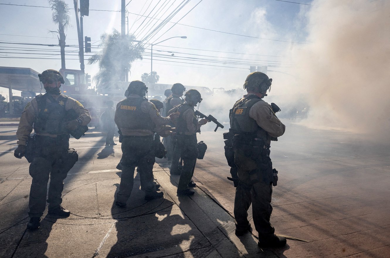 "image_caption": "<p data-block-key=\"p8oec\">Los Angeles County Sheriff’s deputies at a protest in Compton, California, on June 7, 2025. A deputy targeted freelance photojournalist Ethan Noah Roy with a crowd-control munition while he was covering the demonstration from adjacent Paramount.</p>",