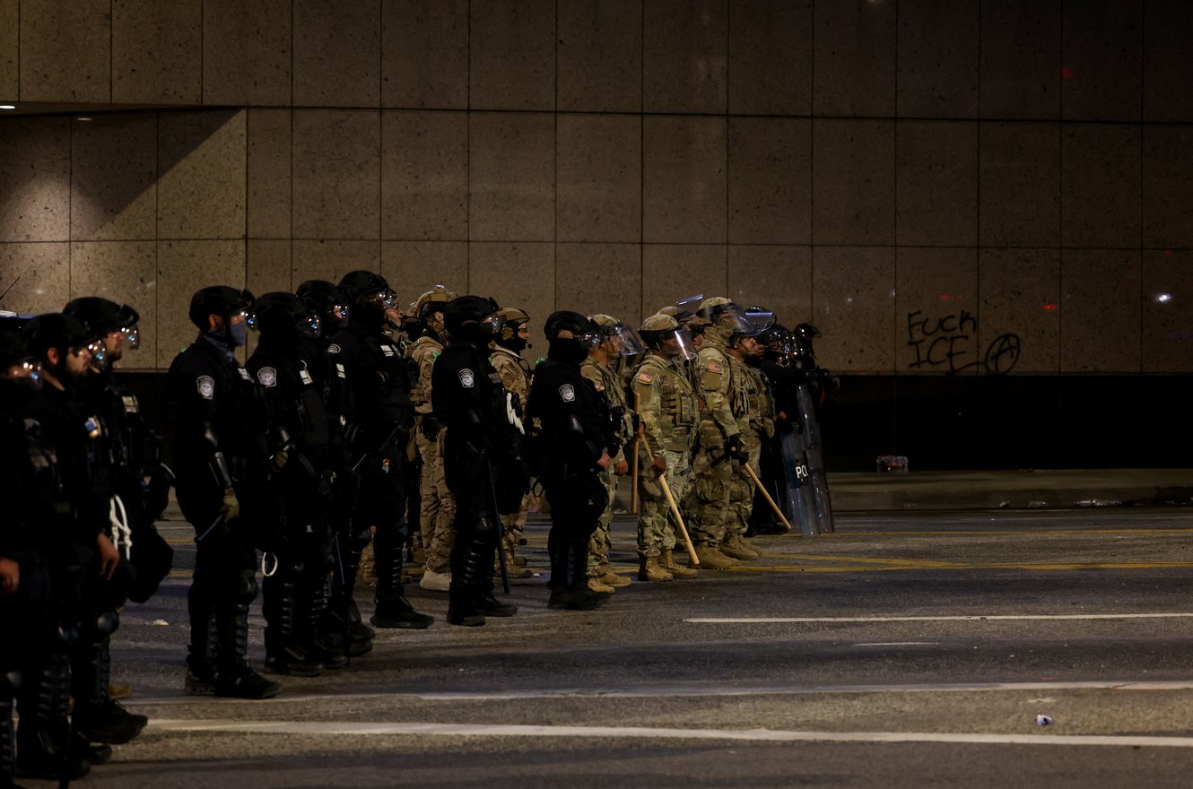 "image_caption": "<p data-block-key=\"v5ira\">Law enforcement officers stand on a freeway in downtown Los Angeles on June 8, 2025, following an immigration protest the previous night. L.A. Taco investigative journalist Lexis-Olivier Ray was struck with pepper balls while reporting on the protest.</p>",