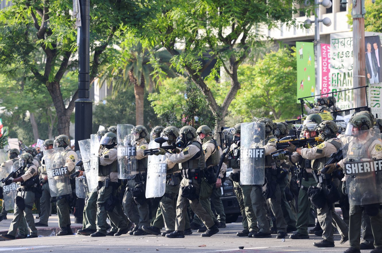 "image_caption": "<p data-block-key=\"au9z2\">Los Angeles County Sheriff’s deputies form a line as they respond to protests in downtown LA on June 11, 2025. Moments after capturing this photo, photojournalist Jen Golbeck was shot with multiple pepper ball munitions.</p>",