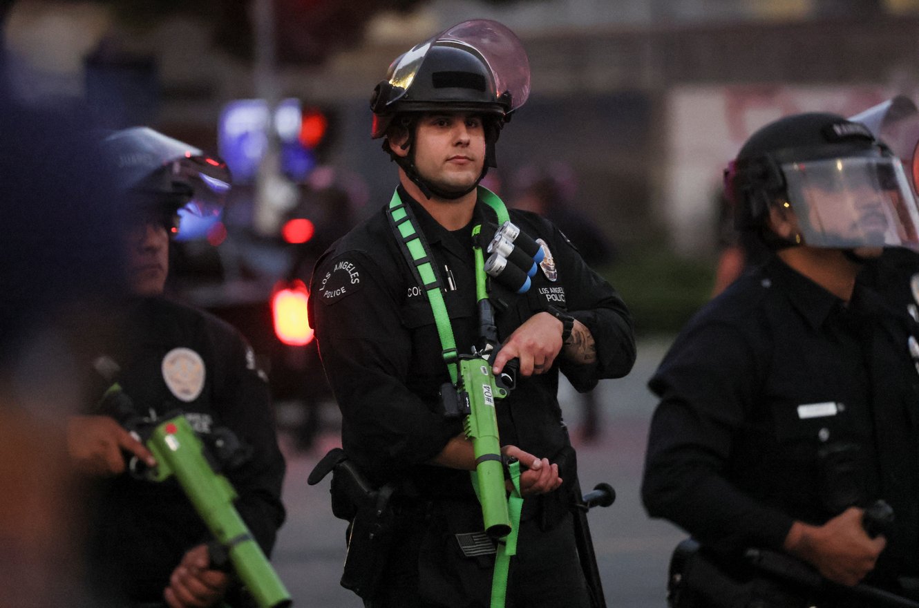 "image_caption": "<p data-block-key=\"pqpi3\">Law enforcement carry crowd-control weapons during an immigration protest in Los Angeles, California, on June 10, 2025. An Australian cameraman was struck with a projectile while covering the demonstration.</p>",