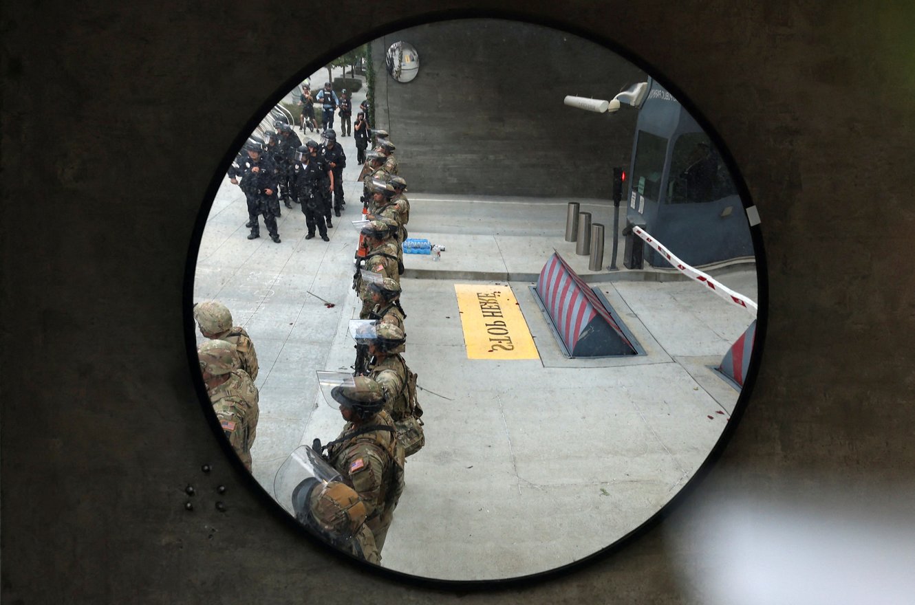 "image_caption": "<p data-block-key=\"dqiv4\">Sheriff’s deputies stand guard at City Hall during a “No Kings” protest against President Donald Trump’s policies on June 14, 2025, in Los Angeles, California. Photojournalist Griffin O’Rourke was struck by a projectile while covering the demonstration.</p>",