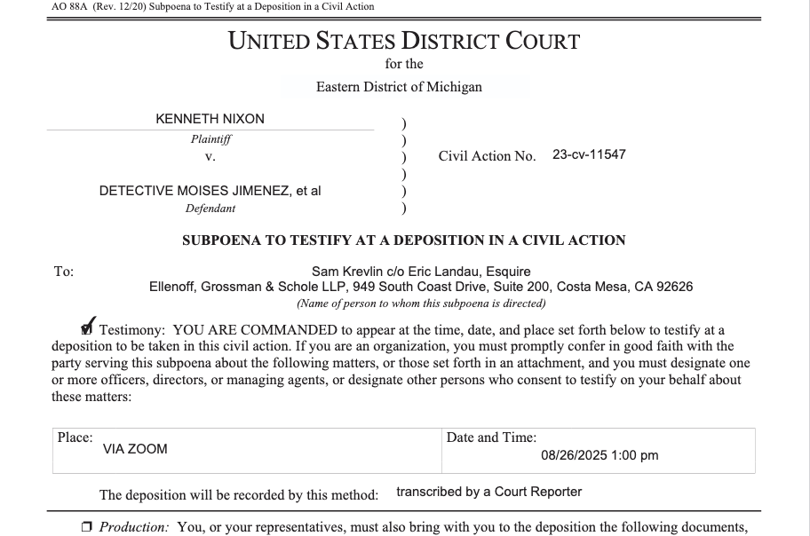 "body": "<div class=\"block-rich_text\"><p data-block-key=\"w0191\">Former student journalist Sam Krevlin was subpoenaed in connection with a civil suit in Detroit, Michigan, on Aug. 5, 2025, ordering him to appear remotely to testify about journalistic work he conducted at Northwestern University seven years earlier.</p><p data-block-key=\"35rt8\">Krevlin, who did not respond to requests for comment, was an undergraduate at the university’s Medill School of Journalism in Evanston, Illinois, in 2018 when he was selected to participate in the Medill Justice Project, now known as the Medill Investigative Lab. According to court filings, he was assigned to the team reporting on Kenneth Nixon, who claimed he was innocent of the 2005 homicide for which he had been incarcerated.</p><p data-block-key=\"dqp7r\">The team’s reporting was <a href=\"https://www.freep.com/story/news/2018/10/27/kenneth-nixon-life-sentence/1739835002/\">published</a> by the Detroit Free Press in October 2018. Nixon was <a href=\"https://www.freep.com/story/news/local/michigan/wayne/2021/02/18/detroit-kenneth-nixon-prison-trial-unfair/4488703001/\">exonerated and released</a> from prison two years later, 16 years after his conviction.</p><p data-block-key=\"8t4cv\">In June 2023, Nixon filed a <a href=\"https://loevy-content-uploads.s3.amazonaws.com/uploads/2023/06/Kenneth-Nixon-v.-Detroit-et-al.pdf\">federal lawsuit</a> with claims against the city of Detroit — which were later dismissed — and members of its police department, alleging that they framed him.</p><p data-block-key=\"cjbou\">As part of pretrial discovery in that suit, in March 2025 the defendants <a href=\"https://pressfreedomtracker.us/all-incidents/subpoena-issued-for-student-reporting-on-wrongful-imprisonment-case\">sent Krevlin a subpoena</a> for his “entire case file”: email, letter or text communications with sources; interview recordings and transcripts; notes; and any documents received via public records requests.</p><p data-block-key=\"c6jds\">After initial objections and communications in April, attorneys for the police defendants “went dark,” according to Krevlin’s attorneys. Months later, they issued Krevlin a <a href=\"https://storage.courtlistener.com/recap/gov.uscourts.nysd.648691/gov.uscourts.nysd.648691.1.5.pdf\">new subpoena</a>, ordering him to sit for a deposition later that month but without any requests for records.</p><p data-block-key=\"kim\">Attorneys for Krevlin, who now lives in New York, first raised objections to the request Aug. 18 and then filed an official <a href=\"https://storage.courtlistener.com/recap/gov.uscourts.nysd.648691/gov.uscourts.nysd.648691.1.1.pdf\">motion to quash</a> Sept. 3.</p><p data-block-key=\"dm430\">In a <a href=\"https://storage.courtlistener.com/recap/gov.uscourts.nysd.648691/gov.uscourts.nysd.648691.12.0.pdf\">response</a> filed two weeks later, attorneys for the defendants argued that Krevlin had waived his privilege by <a href=\"https://storage.courtlistener.com/recap/gov.uscourts.nysd.648691/gov.uscourts.nysd.648691.12.5.pdf\">discussing</a> his reporting with an investigator for the county prosecutor’s Conviction Integrity Unit in 2020. They also asked that the court order Krevlin to comply with both the deposition and production subpoenas.</p><p data-block-key=\"96o5h\">Krevlin’s attorneys <a href=\"https://storage.courtlistener.com/recap/gov.uscourts.nysd.648691/gov.uscourts.nysd.648691.13.0.pdf\">objected</a> to that request, arguing that the information sought could be obtained from nonprivileged sources; that the requested materials are in the possession of the university, not Krevlin; and that Nixon’s exoneration wasn’t solely on the basis of Krevlin’s reporting and interview with police informant Stanley January Jr.</p><p data-block-key=\"dkdno\">“To the extent the Detroit Free Press Article was the catalyst to question the veracity of Mr. January’s testimony this does not make it the crux of the CIU’s recommendation to overturn Mr. Nixon’s conviction,” Krevlin’s attorneys wrote.</p><p data-block-key=\"ck6ab\">In October, attorneys for the defendants asked U.S. District Judge Margaret Garnett to set a date for oral arguments or to issue a ruling on Krevlin’s motion to quash, citing the ramifications the decision may have for their ongoing discovery efforts. As of publication, no such date or ruling has been entered.</p></div>",