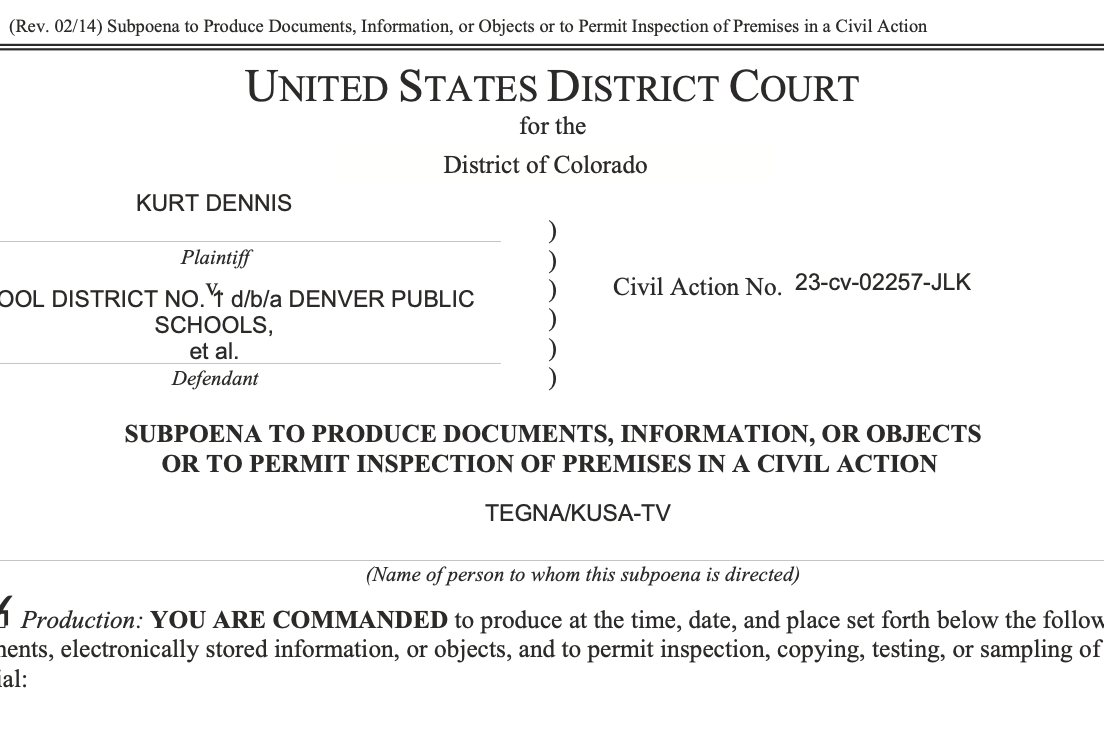 "body": "<div class=\"block-rich_text\"><p data-block-key=\"rs6kl\">TV station KUSA received a subpoena from the Denver, Colorado, school district on Aug. 11, 2025, seeking communications it had for a story with former Principal Kurt Dennis.</p><p data-block-key=\"elar9\">Dennis was fired from a Denver middle school <a href=\"https://www.9news.com/article/news/education/dps-denver-public-schools-fires-principal-after-9news-story-safety-concerns/73-3dfea19d-de73-40ef-9458-437c89b280ea\">after sharing student information</a> with the station and later filed a federal lawsuit claiming the district violated his First Amendment rights.</p><p data-block-key=\"10f3g\">As part of the lawsuit, Denver Public Schools sought KUSA’s unaired footage and communications with Dennis to determine whether he had unlawfully disclosed student information. The district had pointed to a redacted form in the broadcast that differed from the one Dennis submitted in his lawsuit.</p><p data-block-key=\"6rqj9\">During a Dec. 8 court hearing, Dennis’ attorney David Lane admitted that his client had provided the outlet with documents showing a student’s personal identifying information, <a href=\"https://www.coloradopolitics.com/2025/12/08/federal-judge-rejects-dps-attempt-to-obtain-9news-sourcing-documents-in-first-amendment-case/\">Colorado Politics</a> reported.</p><p data-block-key=\"asoq9\">That admission prompted U.S. District Judge John Kane to quash the subpoena, noting the district could obtain the information directly from Dennis.</p><p data-block-key=\"f0lki\">“Mr. Dennis is one of two parties in possession of the documents — the other being KUSA — and he has produced them,” Kane said, according to Colorado Politics. “I do not hold that overriding the reporter’s privilege in this case is appropriate.”</p><p data-block-key=\"lcf2\">Dennis spoke to KUSA shortly after a high school student shot two administrators in 2023 during a routine pat-down. He told the station that another student with serious criminal allegations was subject to the same protocol at his school, but the district denied his requests to expel or block the student from attending school in person.</p><p data-block-key=\"5m3ir\">Dennis had tried to redact the student’s name, but had failed to maintain the student’s anonymity, KUSA attorney Steven Zansberg told the U.S. Press Freedom Tracker in a statement.</p><p data-block-key=\"5fp0i\">Zansberg called the subpoena “legally deficient” and “utterly frivolous” once Dennis provided the documents he had shared with the station.</p><p data-block-key=\"aa3oj\">“Once Dennis confessed that previously contested fact, there was absolutely no legal basis for DPS to continue pursuing its ‘fishing expedition’ subpoena against the station,” Zansberg wrote.</p><p data-block-key=\"1vkg5\">Bill Good, a spokesperson for the school system, told the Tracker in a statement that the district filed the motion to prove Dennis violated the federal Family Educational Rights and Privacy Act and state juvenile records laws by giving unredacted documents to the media.</p><p data-block-key=\"dhq0i\">Good called the process a win, noting the school system received additional documentation from the former principal’s counsel that had not been previously shared.</p><p data-block-key=\"6oitv\">“DPS does not believe it would have received these additional materials absent its attempt to compel 9News to comply with a lawfully issued subpoena,” he wrote.</p></div>",