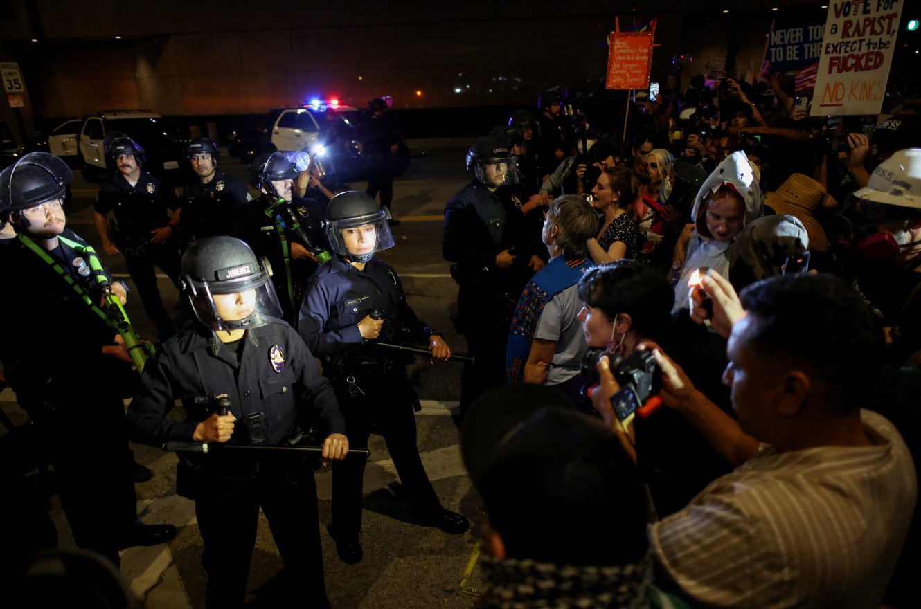 "image_caption": "<p data-block-key=\"5p8st\">Demonstrators and police officers face off during a “No Kings” protest against the Trump administration in Los Angeles, California, on Oct. 18, 2025. Reporter Ryanne Mena was struck with a police baton while covering the rally.</p>",
