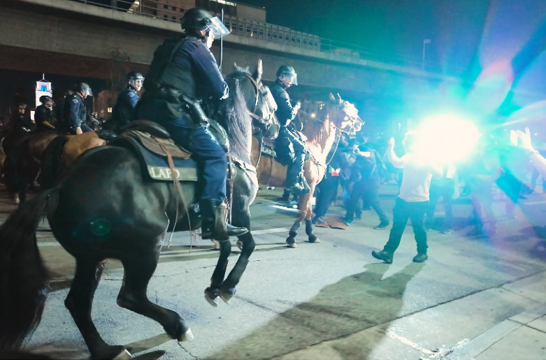 "body": "<div class=\"block-rich_text\"><p data-block-key=\"u7by9\">Los Angeles Daily News reporter Ryanne Mena was pushed by police and struck with a baton by an officer on horseback while documenting the “No Kings” protest in downtown Los Angeles, California, on Oct. 18, 2025.</p><p data-block-key=\"429ot\">Mena told the U.S. Press Freedom Tracker that she was not on assignment that evening but had gone to document the event, informing her editors.</p><p data-block-key=\"1qeu3\">She said the protest, one of thousands nationwide that day voicing opposition to the Trump administration, was peaceful up until 7:30 p.m., when the Los Angeles Police Department declared an unlawful assembly.</p><p data-block-key=\"7v1ci\">By that point, Mena was near the Metropolitan Detention Center, where officers had already blocked off part of the area with police tape.</p><p data-block-key=\"bqkm3\">“They wouldn’t let members of the press through,” she said.</p><p data-block-key=\"af3a6\">When the police line began advancing down the street, Mena said mounted officers pushed through both protesters and members of the press. When one officer on foot pushed her, Mena reminded her she was a journalist.</p><p data-block-key=\"elu5p\">“She looked down and saw my credentials and kind of backed off,” Mena said.</p><p data-block-key=\"83o13\">As the crowd was pushed farther down the street, Mena remained on the sidewalk filming when she said she and other journalists were violently shoved. She said she felt a pole-like object, which she believes was a police baton, swing against her left arm, leaving a bruise.</p><p data-block-key=\"e28gl\">“It all happened so fast,” said Mena, who added that police officers also deployed crowd-control munitions into the gathering.</p><p data-block-key=\"a0v3h\">Mena, who was wearing a tactical vest marked “press” and two visible press credentials around her neck, said she couldn’t definitively say if she was targeted as a member of the media in either incident.</p><p data-block-key=\"dpqa3\">“It was pretty clear that we were there just documenting events, and that didn’t protect us,” she added.</p><p data-block-key=\"eedr5\">The police actions at the rally appeared to violate a state law prohibiting officers from using force against members of the press.</p><p data-block-key=\"ah9c\">They also seemed to flout <a href=\"https://pressfreedomtracker.us/all-incidents/journalist-struck-with-baton-finger-injured-amid-protests-in-downtown-la/\">a preliminary injunction</a> issued earlier this fall that bars the LAPD during protests from restricting press access to areas that are not crime scenes.</p><p data-block-key=\"fkrgs\">The LAPD said in a statement that it is investigating all use-of-force incidents from Oct. 18 and could not comment on active investigations.</p></div>",