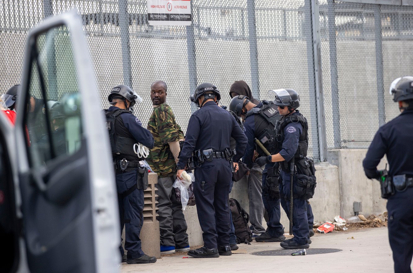 "image_caption": "<p data-block-key=\"jd91l\">Police push press back at an immigration protest in Los Angeles, California, on April 11, 2026. Photojournalist Nick Stern was kicked by an officer while documenting the demonstration.</p>",
